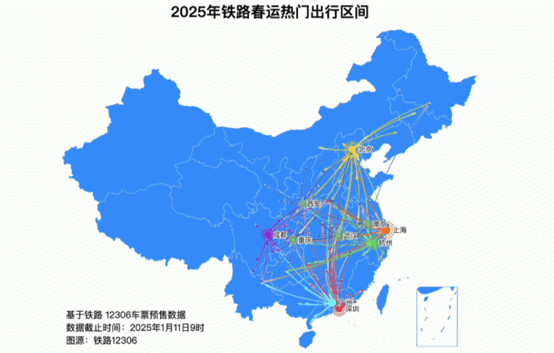 从现在车票预售情况看,热点开拔城市主要有上海、广州、北京、深圳、杭州、成王人、武汉、南京、重庆、长沙;热点到达城市主要有北京、广州、武汉、成王人、上海、重庆、郑州、长沙、西安、杭州;广州至南宁、广州至武汉、深圳至长沙、深圳至武汉、苏州至上海、广州至长沙、上海至北京、广州至重庆、北京至哈尔滨、上海至武汉等热点区间客流相对集会。